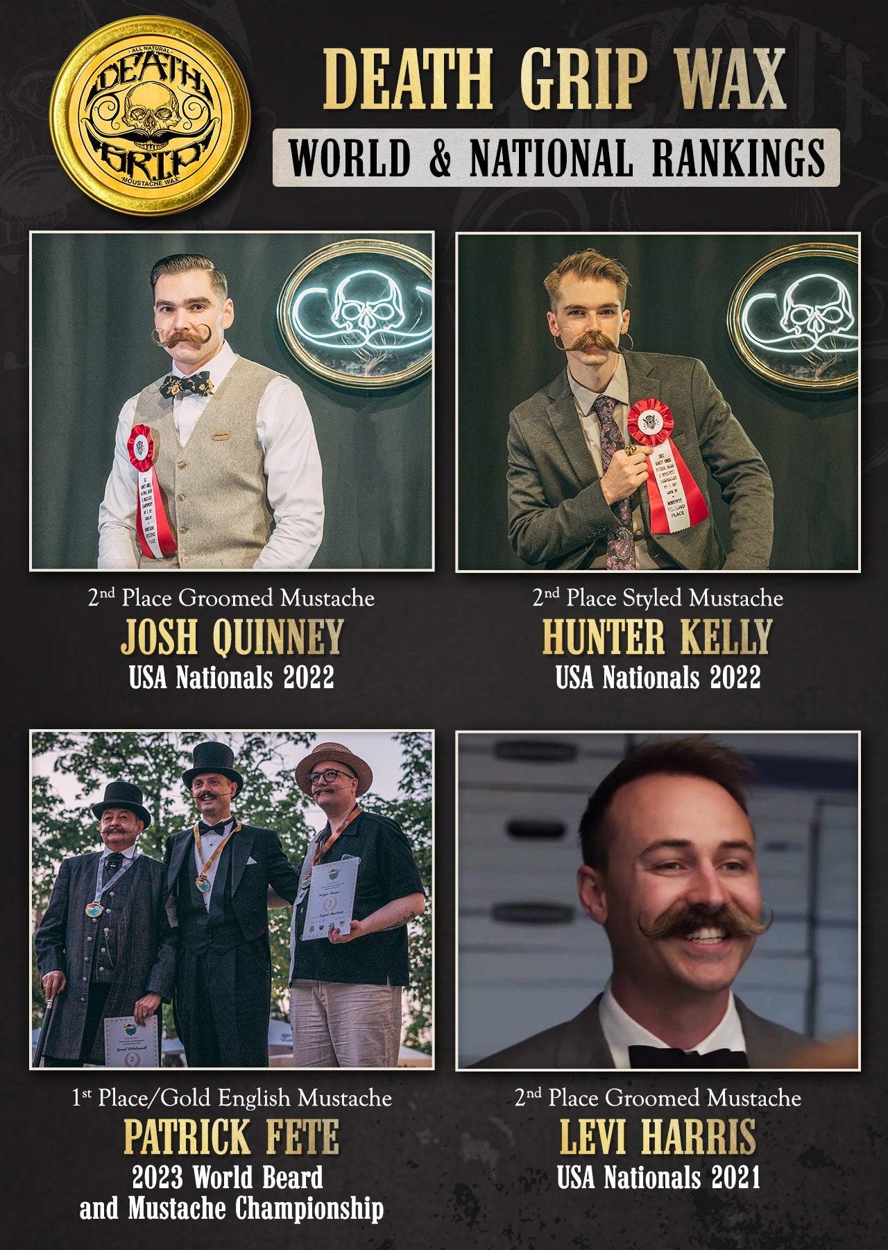 Death Grip Mustache Wax - the ultimate styling solution for serious mustache enthusiasts. If you're looking for a wax that will give your mustache a firm, extra strong hold that lasts all day, look no further. This national championship award-winning wax is the best of the best and has received over 10,000+ customer reviews.